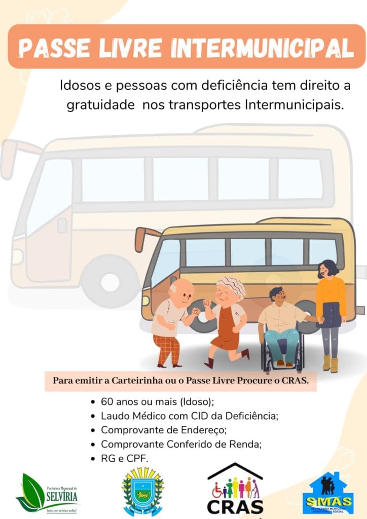 Idosos com mais de 60 anos e pessoas com deficiência ou patologia crônica, tem direito ao passe livre para utilização do transporte rodoviário intermunicipal. Para ter acesso ao benefício, basta procurar o Centro de Referência em Assistência Social (CRAS) de Selvíria.