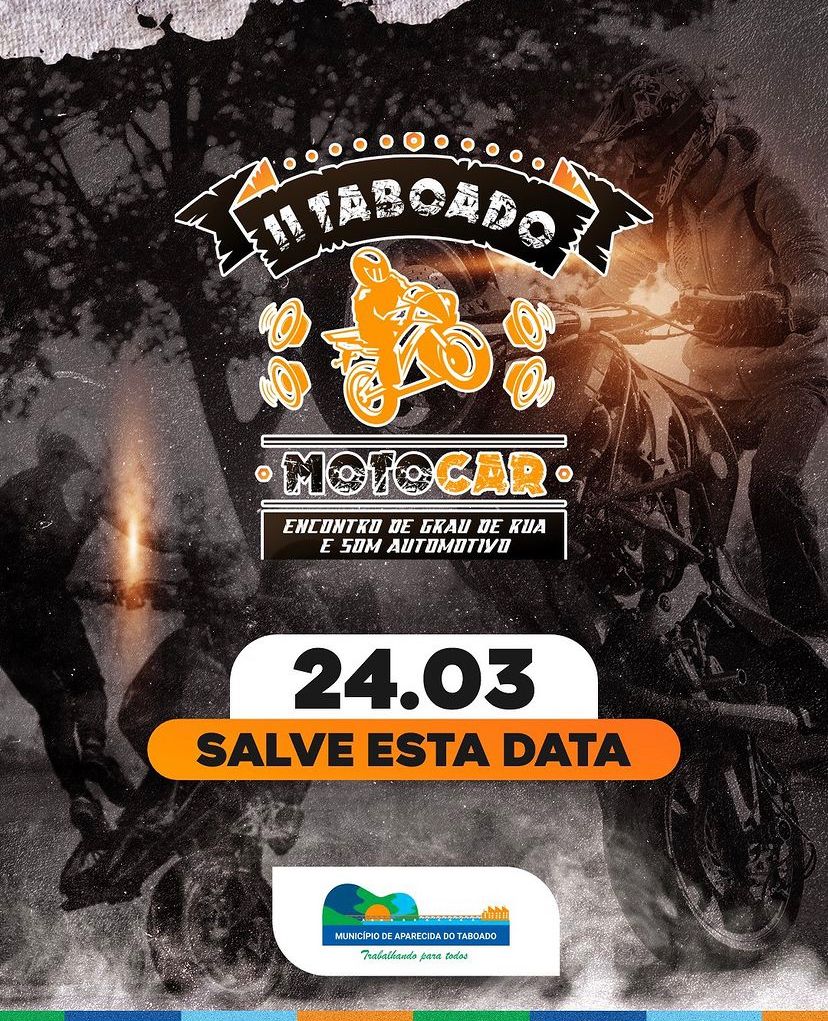 Aparecida do Taboado (MS) – A Prefeitura Municipal, através das redes sociais, divulgou hoje (20), a data da 2ª edição do Taboado Motocar, um evento que reúne o grau de rua e som automotivo.