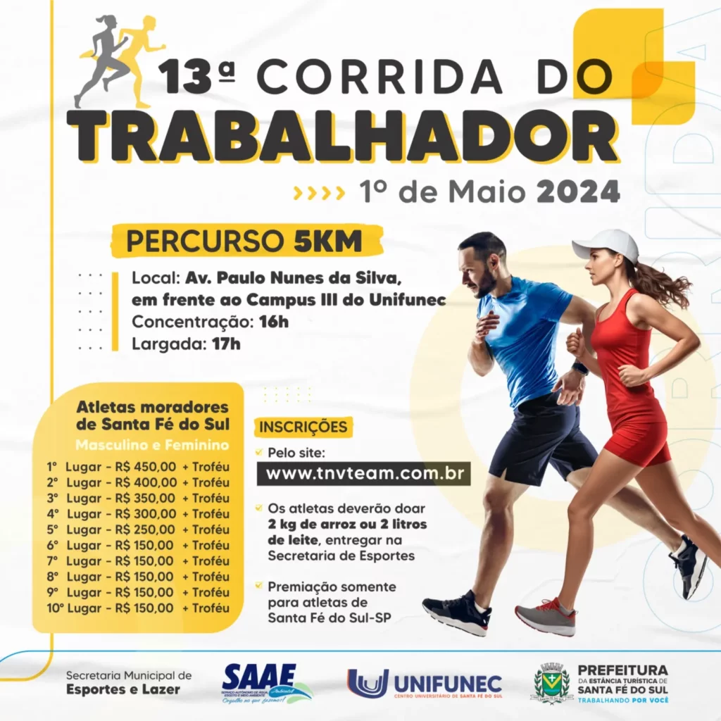 A 13ª Corrida do Trabalhador está aberta para atletas profissionais e amadores de todas as localidades, porém apenas os moradores de Santa Fé do Sul participarão das premiações. Mais informações sobre o evento pelo telefone 3631-7371.