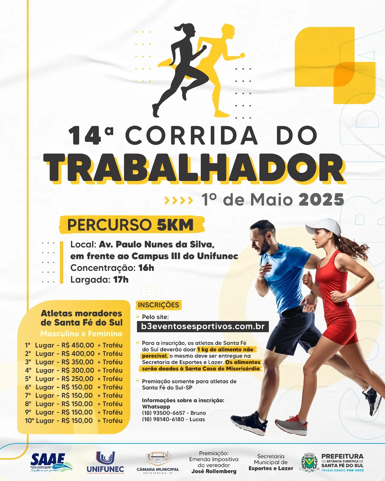 “A 14ª Corrida do Trabalhador é aberta para atletas amadores e profissionais de todas as localidades, mas só os atletas residentes em Santa Fé do Sul participarão da premiação. Quero convidar a todos que têm interesse que façam suas inscrições, que vão até o dia 30, e venham participam com a gente desse grande evento”, disse o secretário Mateus Messaros.