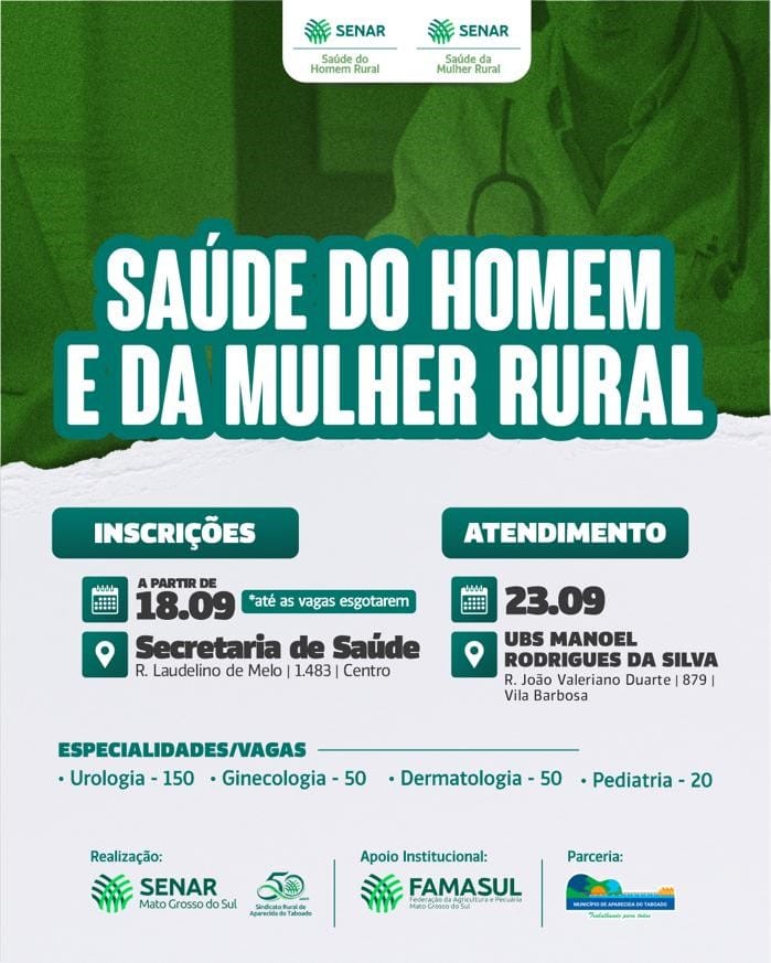 Aparecida do Taboado (MS) – Ainda estão abertas as inscrições para mais uma edição do Programa Saúde do Homem e da Mulher promovido no município pelo Senar-MS em parceria com o Sindicato Rural e a Prefeitura, através da Secretaria de Saúde.