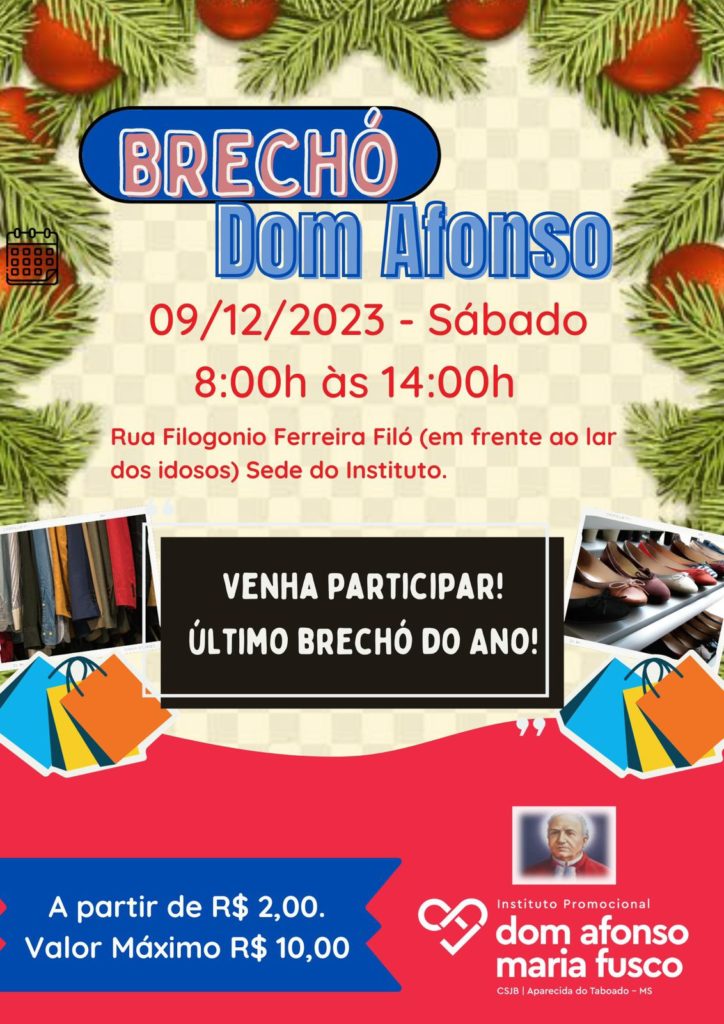 Aparecida do Taboado (MS) – Neste sábado (09), o Instituto Promocional Dom Afonso Maria Fusco, realizará mais um bazar beneficente, com várias opções de peças de roupas, agasalhos, calçados e acessórios. Tudo no valor de R$2,00.
