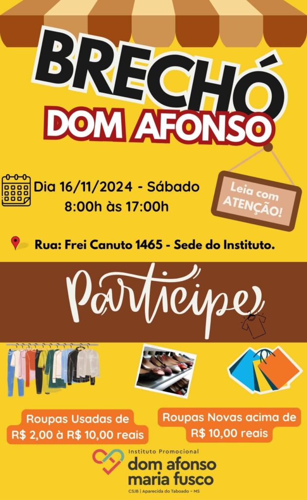 Aparecida do Taboado (MS) – Em mais um brechó beneficente, o Instituto Promocional Dom Afonso Maria Fusco promoverá a ação neste sábado (16) das 08h às 17h na sede do instituto, localizado na Rua Frei Canuto, 1465 (em frente ao lar dos idosos).