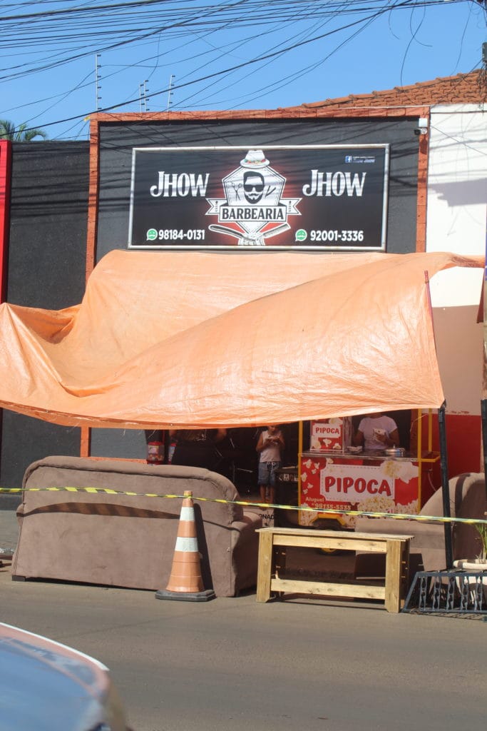 Para mais bem-estar dos clientes e acompanhantes, foi montada uma estrutura do lado externo da barbearia, com acomodações, pula-pula e pipoca.