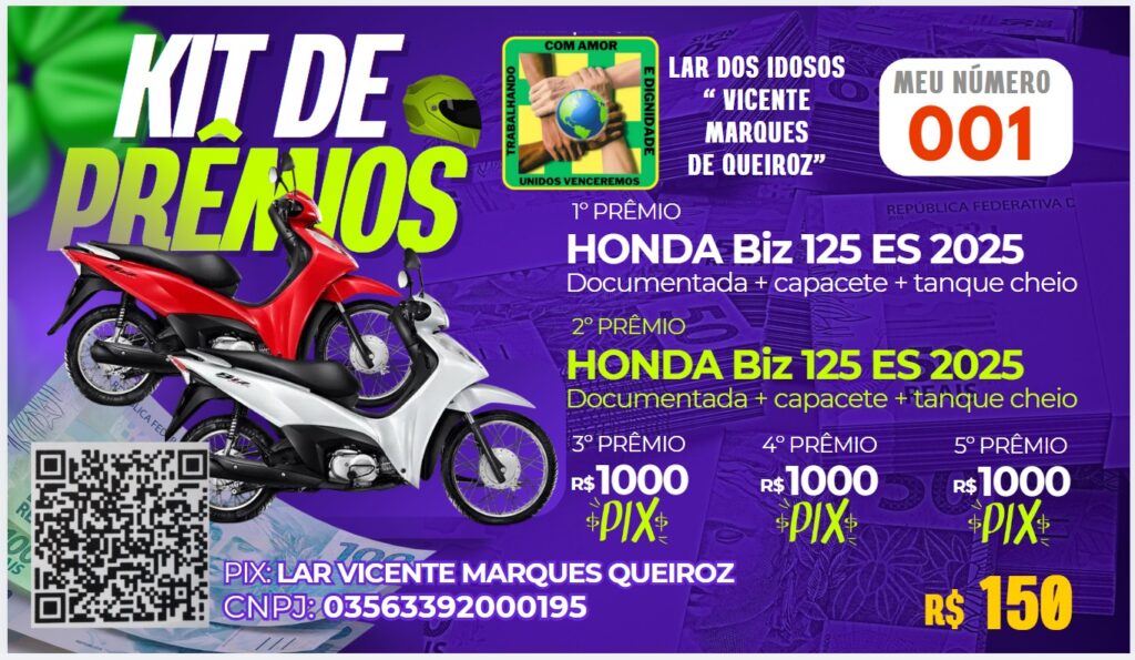 1º prêmio – Honda Biz 125 – ano 2025, documentada, capacete e tanque cheio