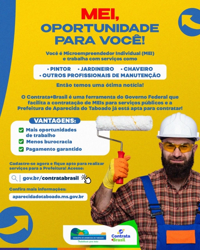 Por meio do Contrata+Brasil, a Prefeitura de Aparecida do Taboado agora está apta a contratar microempreendedores individuais como pintor, jardineiro, chaveiro, eletricista, encanador ou em outros serviços de manutenção.