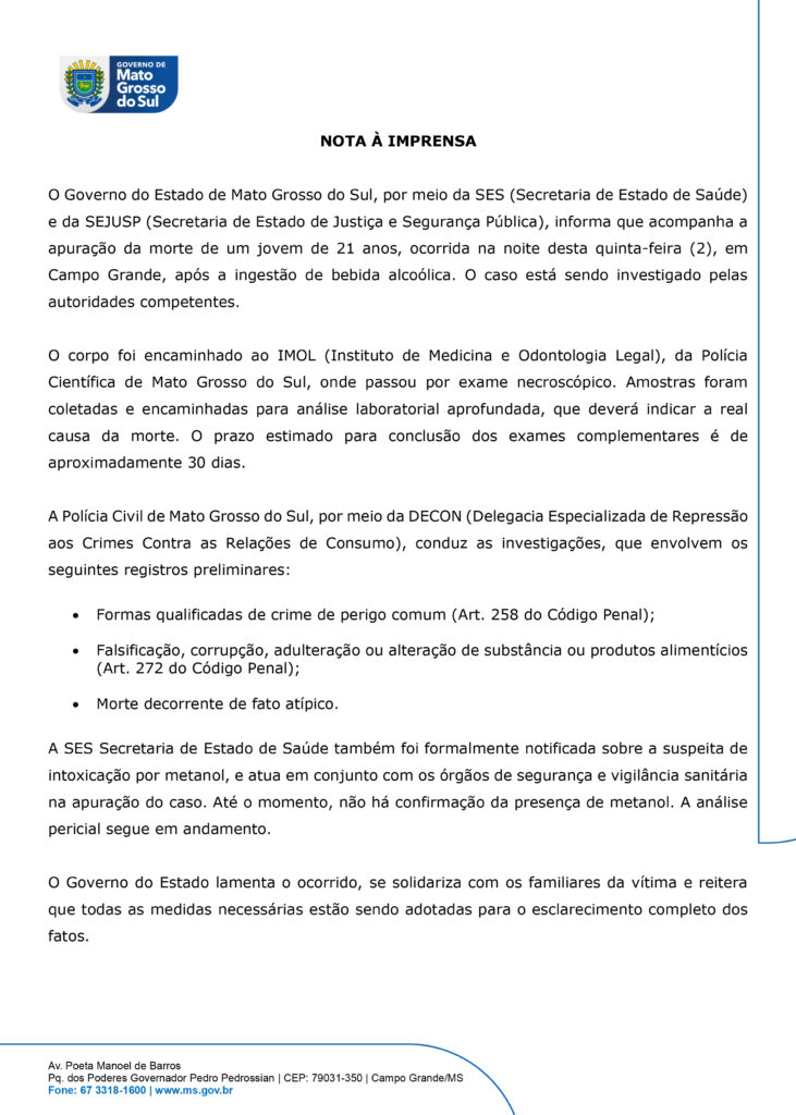 Em nota oficial, o Governo do Estado de Mato Grosso do Sul, por meio da SES (Secretaria de Estado de Saúde) e da SEJUSP (Secretaria de Justiça e Segurança Pública), informou que acompanha o caso, que está sendo apurado pela Polícia Civil, através da DECON (Delegacia de Repressão aos Crimes Contra as Relações de Consumo).