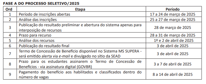 Para participar do Processo Seletivo, os alunos precisarão preencher o cadastro disponível no site da Sead (www.sead.ms.gov.br) anexando os documentos necessários. Eles deverão estar devidamente matriculados em cursos de educação profissional técnica de nível médio ou em universidades públicas ou privadas, ser residente em Mato Grosso do Sul há mais de 2 anos, e não podem receber outro tipo de benefício remunerado ou de auxílio financeiro com a mesma finalidade.