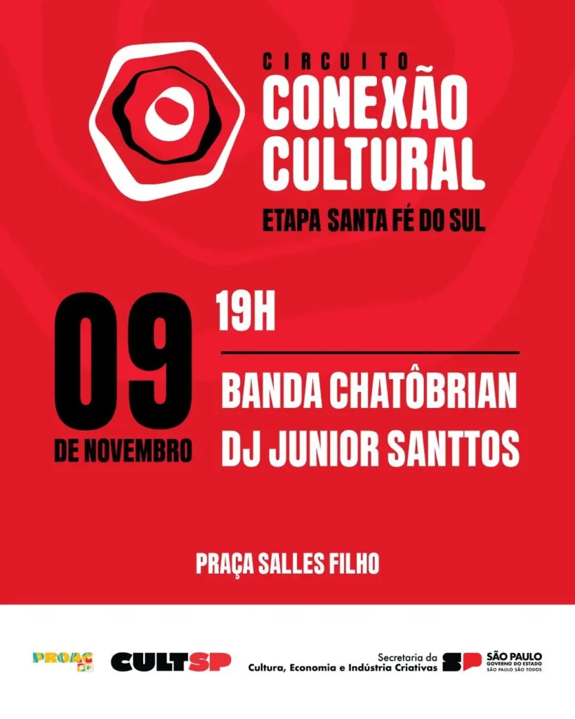 Neste sábado, 9 de novembro, a EstânciaTurística de Santa Fé do Sul receberá a etapa do Circuito Conexão Cultural, o evento é realizado pelo ProAC – Programa de Ação Cultural, em parceria com a Secretaria da Cultura, Economia e Indústria Criativas do Estado de São Paulo e Governo Municipal, por meio da Secretaria de Cultura e Turismo.