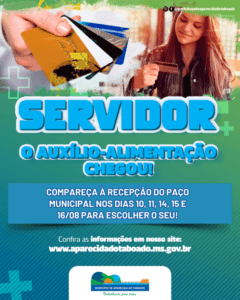 No período entre 10, 11, 14, 15 e 16 de agosto, os servidores da prefeitura de Aparecida do Taboado deverão estar realizando a escolha da empresa para fornecer o cartão alimentação.