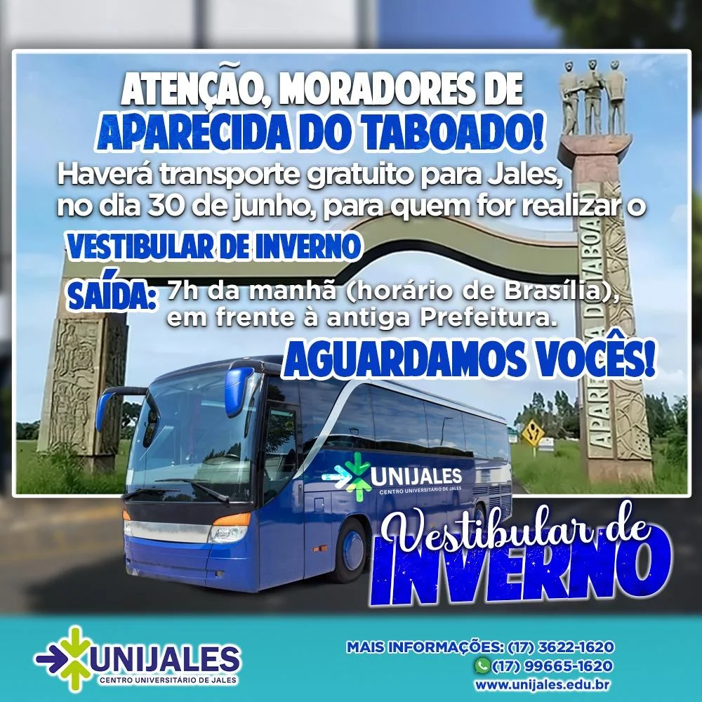 Vestibulandos de Aparecida do Taboado/MS terão uma oportunidade especial neste domingo (30) para prestar o Vestibular de Inverno do Centro Universitário de Jales – UNIJALES. Um ônibus gratuito sairá às 7h da manhã (horário de Brasília) em frente à antiga prefeitura, garantindo o transporte dos candidatos.
