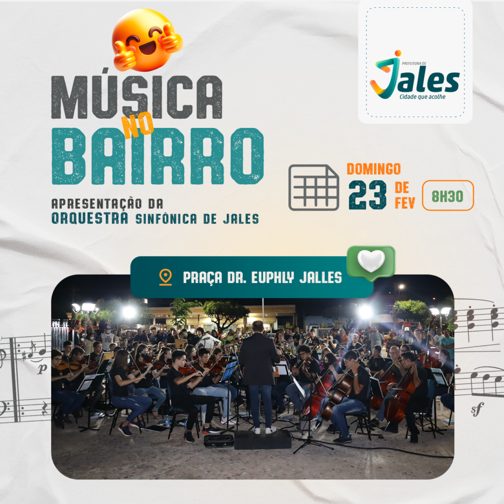 Abrindo a programação do projeto Música no Bairro, a Orquestra Sinfônica de Jales se apresentará no próximo domingo, dia 23, na Praça Dr. Euphly Jalles. O evento é promovido pela Prefeitura de Jales, por meio da Secretaria de Cultura e Turismo.