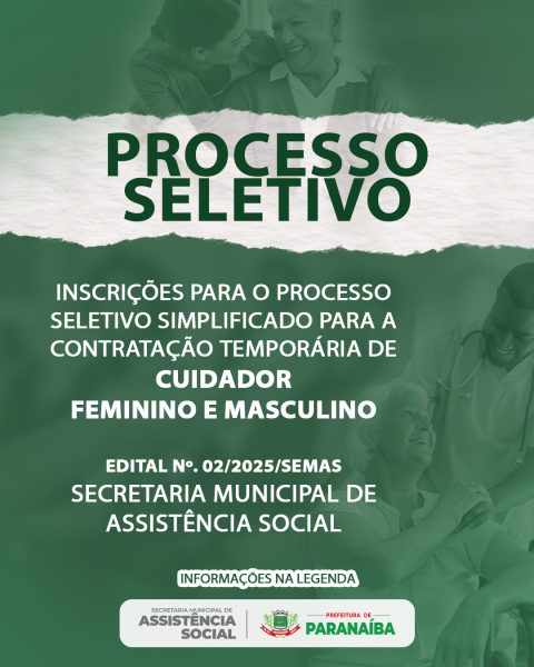 A Prefeitura de Paranaíba, por meio da Secretaria Municipal de Assistência Social, informa que estão abertas as inscrições para o cargo de Cuidador, nas modalidades feminino e masculino.
