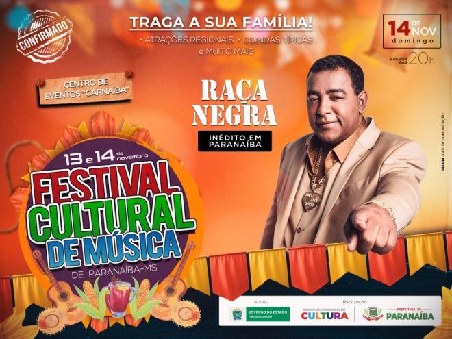 Nos dias 13 e 14 de novembro, no Centro de Eventos Carnaíba, a Prefeitura de Paranaíba irá realizar o 1º Festival Cultural de Música com diversas atrações, tendo como principal apresentação o show do Raça Negra.