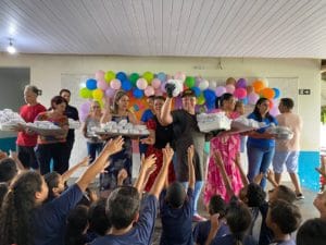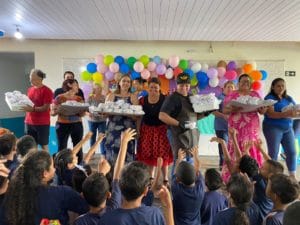 Aparecida do Taboado (MS) – Durante a manhã desta sexta-feira (06), a equipe do Boi Bom Café-Bar esteve presente na Escola João Luiz Pereira para mais um ano de ação social. Este é o sétimo ano que a parceria é realizada e o primeiro ano que são servidos hamburguers para alegrar ainda mais o Dia das Crianças.