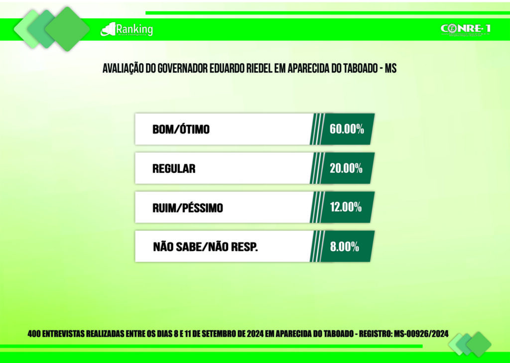 O Instituto Ranking Brasil Inteligência também avaliou que o governador Eduardo Riedel (PSDB) no município é considerado bom ou ótimo para 60% dos entrevistados, enquanto 20% falaram que é regular e 12% disseram que é ruim ou péssimo, sendo que 8% declararam que não sabem ou não responderam.