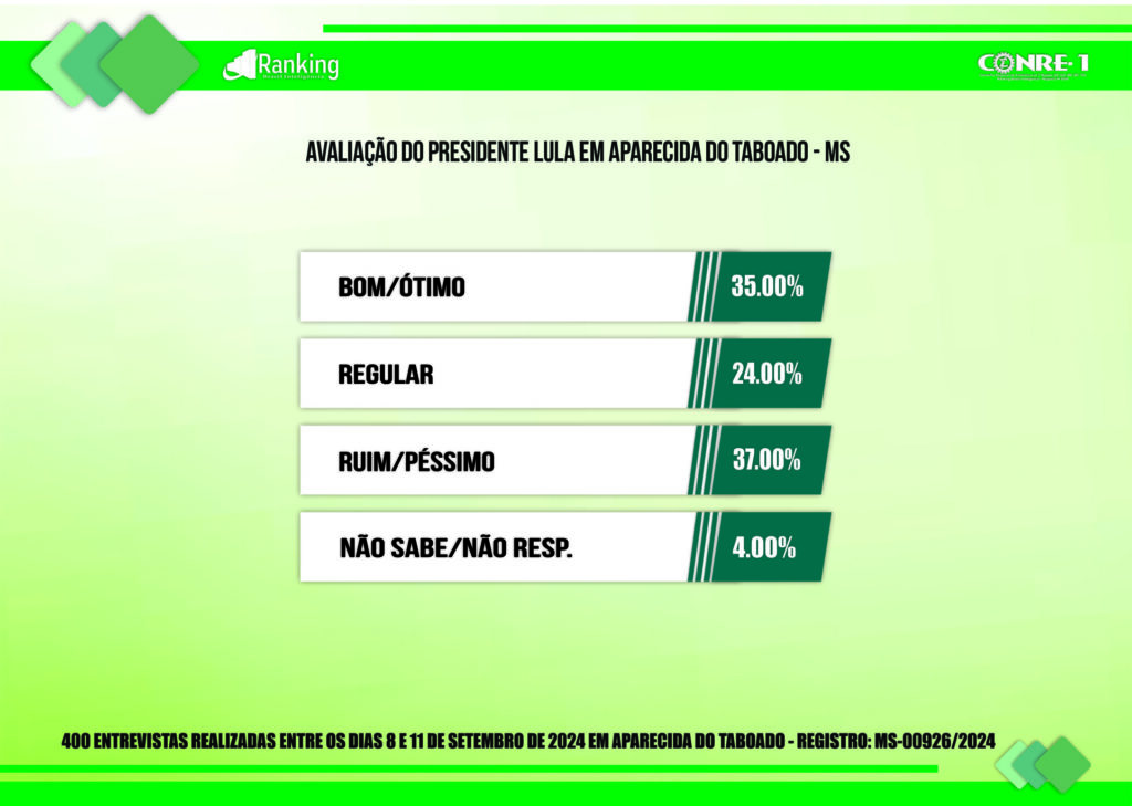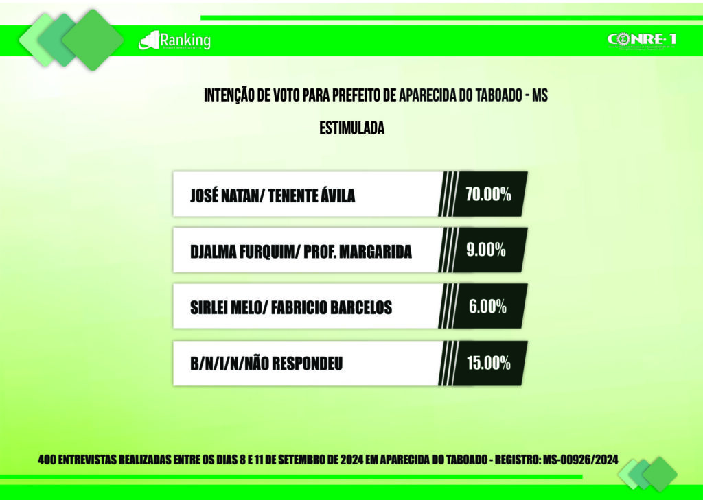 O Instituto Ranking Brasil Inteligência também avaliou a gestão do prefeito de Aparecida do Taboado, José Natan, e 80% dos entrevistados consideraram boa ou ótima, enquanto 9% disseram que é regular e 7% classificaram como ruim ou péssima, sendo que 4% não responderam ou não sabem.