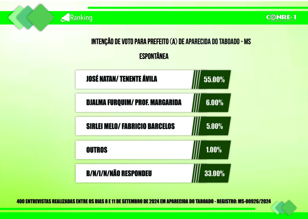 Pesquisa registrada no TSE (Tribunal Superior Eleitoral) sob o nº MS- MS-00926/2024, o Instituto Ranking Brasil Inteligência realizou, no período de 8 a 11 de setembro deste ano, junto a 400 moradores de Aparecida do Taboado (MS), com 16 anos ou mais de idade, a primeira pesquisa de intenção de votos para a Prefeitura Municipal nas eleições 2024, tendo intervalo de confiança de 95% e uma margem de erro de 4,85%, para mais ou para menos.