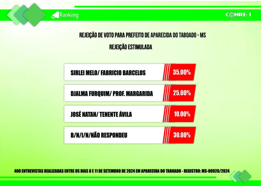 No quesito rejeição estimulada, Sirlei Melo está na frente, com 35%, enquanto Djalma Furquim vem logo atrás, com 25%, e José Natan aparece bem distante, com 10%, sendo que 30% dos entrevistados não sabem ou não responderam.