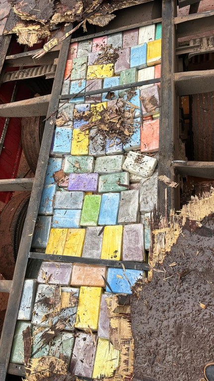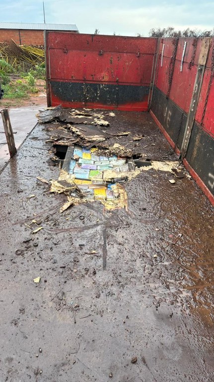Após retirar, com o auxílio de maquinário pesado, a carga de sucatas de ferro do semirreboque, foi possível identificar que havia um compartimento oculto no local identificado com sinais de adulteração. Aberto o compartimento oculto, foram encontrados diversos tabletes da substância entorpecente, totalizando 414,3 kg de droga apreendida.