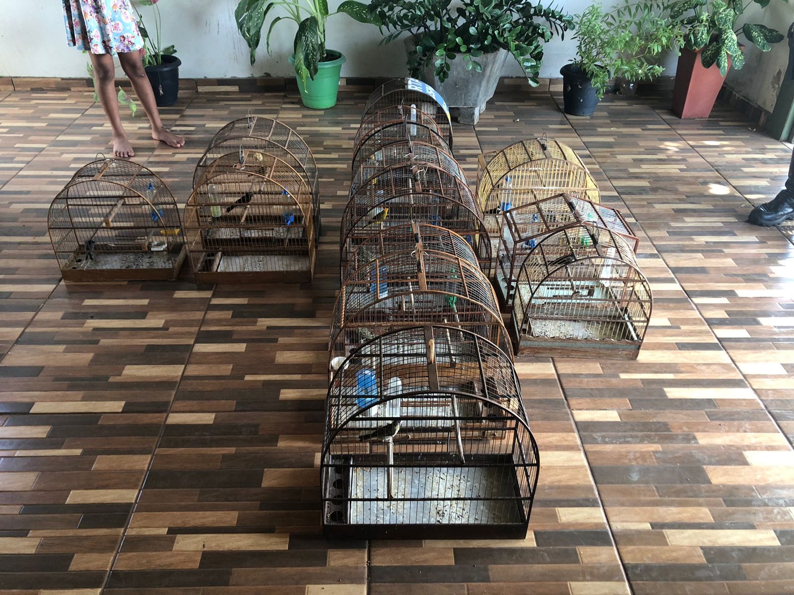 No local, os Policiais apreenderam em gaiolas 8 (oito) aves da espécie canário-da-terra (Sicalis flaveola brasiliensis), 4 (quatro) da espécie papa-capim (Sporophila caerulescens), 2 (dois) da espécie curió (Sporophila angolensis) e 1 (um) da espécie bigodinho (Sporophila collaris) e 15 gaiolas.