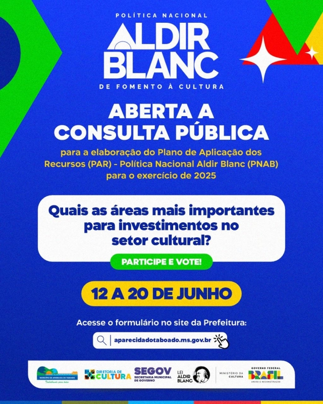 A Prefeitura de Aparecida do Taboado, por meio da Secretaria Municipal de Governo, através da Diretoria de Cultura, abre Consulta Pública Online para ouvir artistas, grupos culturais, coletivos, instituições e cidadãos interessados sobre a aplicação dos recursos da Política Nacional Aldir Blanc de Fomento à Cultura (PNAB) 2025 no município.
