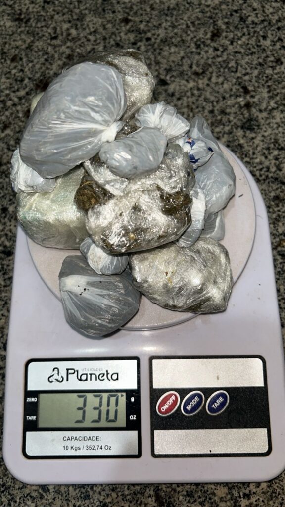Após investigações, os policiais identificaram o autor e, no dia 14 de fevereiro, foram até sua residência. No entanto, o jovem conseguiu fugir. Durante a busca no imóvel, foram encontrados 330 gramas de maconha, 13 porções prontas para venda e um tablete pela metade.