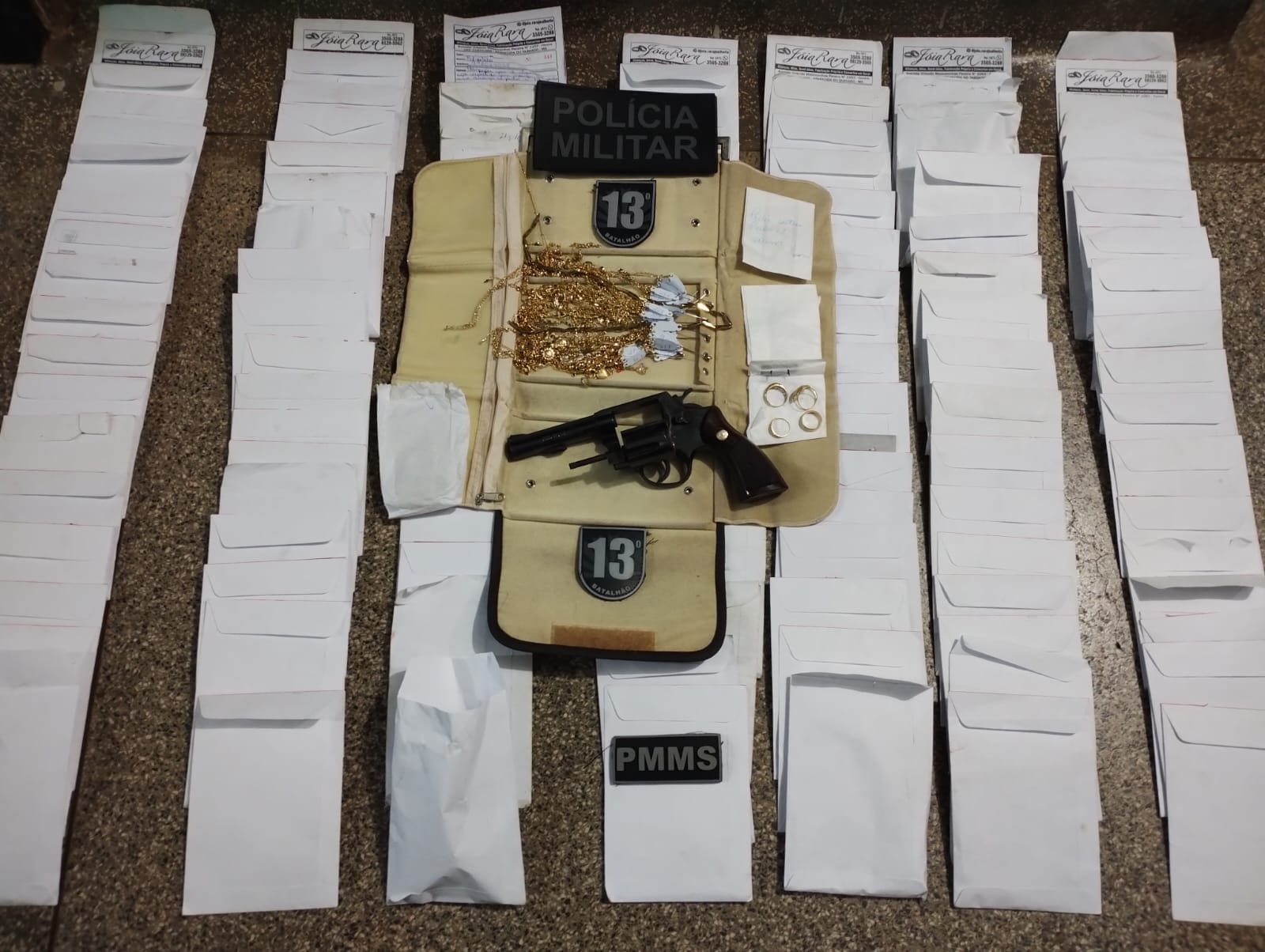 Foi realizada a busca pessoal no suspeito, sendo encontrado com o mesmo a possível arma de fogo utilizada para cometimento do roubo, bem como os objetos roubados, sendo um revólver calibre 38, 05 munições intactas, 01 cartucho deflagrado e uma bolsa com vários envelopes com joias. O acusado não informou o nome de seu comparsa, porém, confessou as equipes policiais que havia cometido roubo a joalheria em Aparecida do Taboado-MS, e em outra joalheria no município de Água Clara-MS.