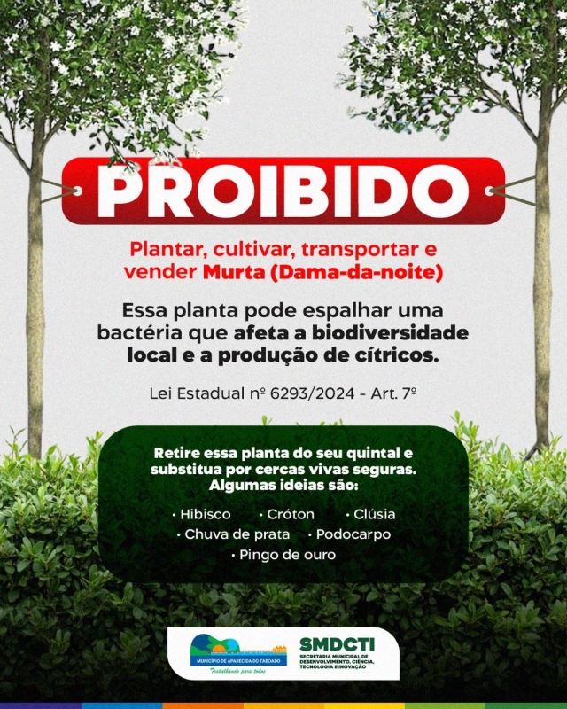 A Murta (Murraya paniculata), também conhecida como Dama-da-noite, é uma grande vilã para a citricultura e precisa ser erradicada. Essa planta exótica serve de hospedeira para a bactéria causadora do greening, uma das doenças mais perigosas para as plantações de laranja e limão. Para combater essa ameaça, o Estado de Mato Grosso do Sul proibiu, por meio da Lei Estadual nº 6293/2024, o cultivo, transporte, produção e comercialização da Murta.