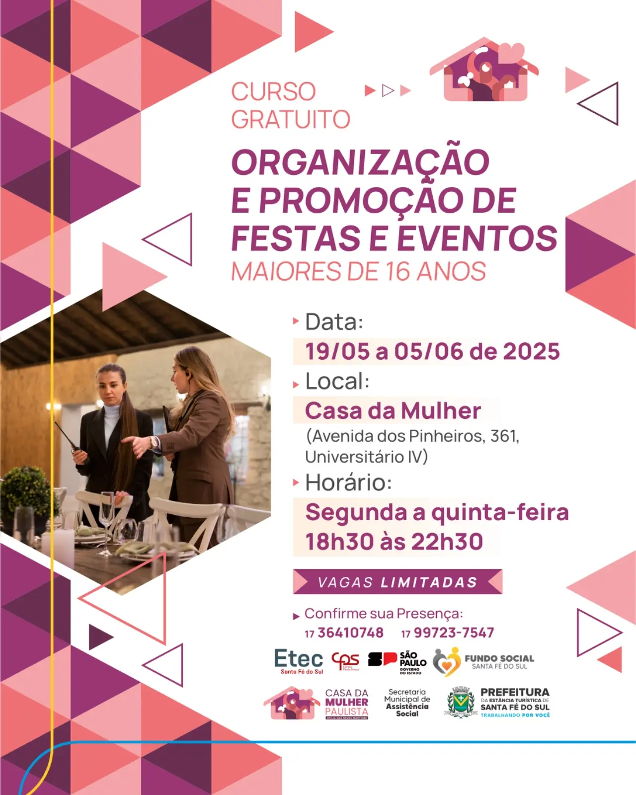 A Prefeitura da Estância Turística de Santa Fé do Sul, por meio da Secretaria Municipal de Assistência Social e do Fundo Social de Solidariedade, em parceria com a Etec Santa Fé do Sul, a Casa da Mulher Paulista e o Governo do Estado de São Paulo, está com inscrições abertas para o curso gratuito de Organização e Promoção de Festas e Eventos, voltado a pessoas acima de 16 anos.