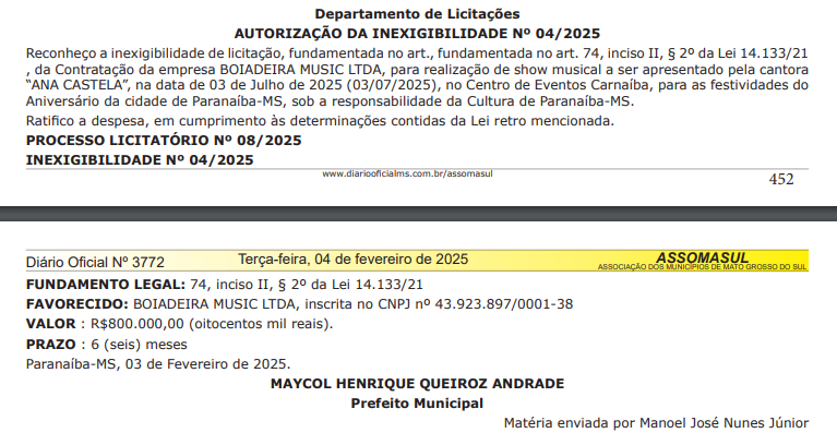 Foi publicada nesta terça-feira (04), no Diário Oficial da Assomasul, a inexigibilidade de licitação que contrata o show da cantora Ana Castela, pela Prefeitura de Paranaíba-MS. A cantora deverá se apresentar no dia 03 de julho, no Centro de Eventos Carnaíba, como parte das festividades do
