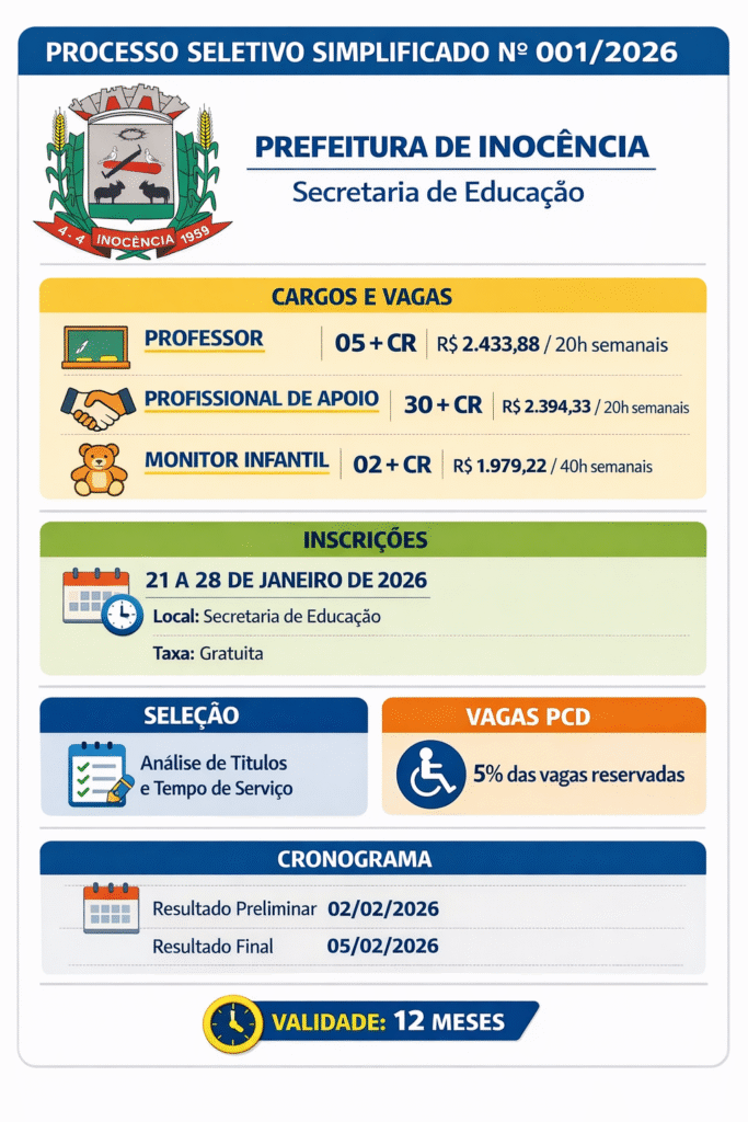 A Prefeitura de Inocência, por meio da Secretaria Municipal de Educação, abriu o Processo Seletivo Simplificado nº 001/2026 para contratação temporária de profissionais que irão atuar na rede municipal de ensino. A seleção tem caráter excepcional e visa atender às demandas da Secretaria ao longo do período estabelecido em edital.