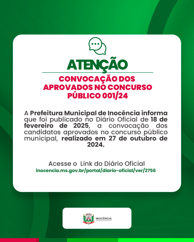 A Prefeitura Municipal de Inocência informa que foi publicado no Diário Oficial de 18 de fevereiro de 2025, a convocação dos candidatos aprovados no concurso público municipal, realizado em 27 de outubro de 2024.