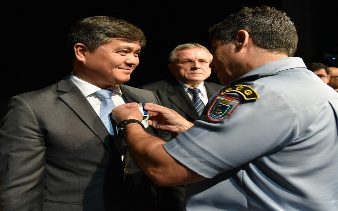 Em Dourados, o presidente do Sistema Famasul, Mauricio Saito, recebeu do DOF – Departamento de Operações de Fronteira, a mais importante medalha concedida pelo grupo, “Águia da Fronteira”. A cerimônia dessa quarta-feira (1º) foi feita pelo secretário de Estado de Justiça e Segurança Pública, José Carlos Barbosa, que na cerimônia representou o governador, Reinaldo Azambuja. Mauricio Saito recebeu a medalha pelas mãos do Diretor do DOF, Coronel Ary Carlos Barbosa.