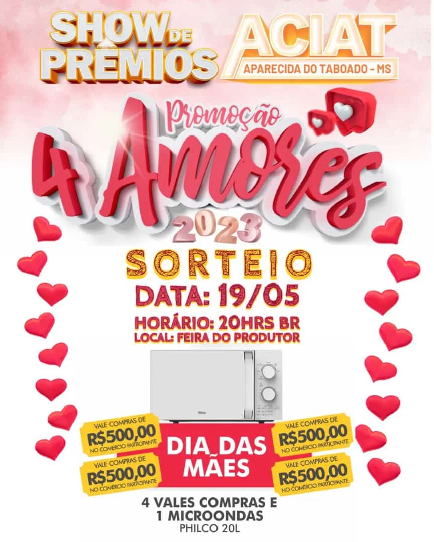 O primeiro sorteio da promoção “4 Amores” que será realizado pela Associação Comercial (ACIAT) com o apoio da Administração Municipal e SINDIVAREJO acontecerá nesta sexta-feira (19) na feira do produtor, em comemoração ao dia das mães. Neste sorteio, os aparecidenses que cadastraram seus cupons terão a chance de ganhar 4 vales-compra no valor de R$500,00 no comércio participante e 1 microondas Philco 20 litros.