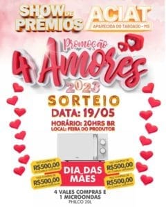 Aparecida do Taboado (MS) – A Associação Comercial (ACIAT) com apoio da Administração Municipal e Sindivarejo, irá realizar nesta sexta-feira (19), o primeiro sorteio da promoção “4 Amores” em comemoração ao dia das mães. A ação acontece anualmente, com objetivo de incentivar os aparecidenses a comprarem no comércio local.