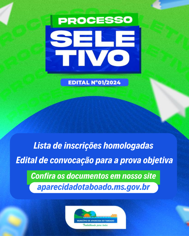 A Prefeitura Municipal de Aparecida do Taboado e o Instituto de Avaliação Nacional – IAN, no uso de suas respectivas atribuições, visando atender os princípios norteadores da administração pública, torna público a convocação de todos os candidatos deferidos no Processo Seletivo 01/2024, para a realização da PROVA OBJETIVA que acontecerá no domingo dia 4 de fevereiro.