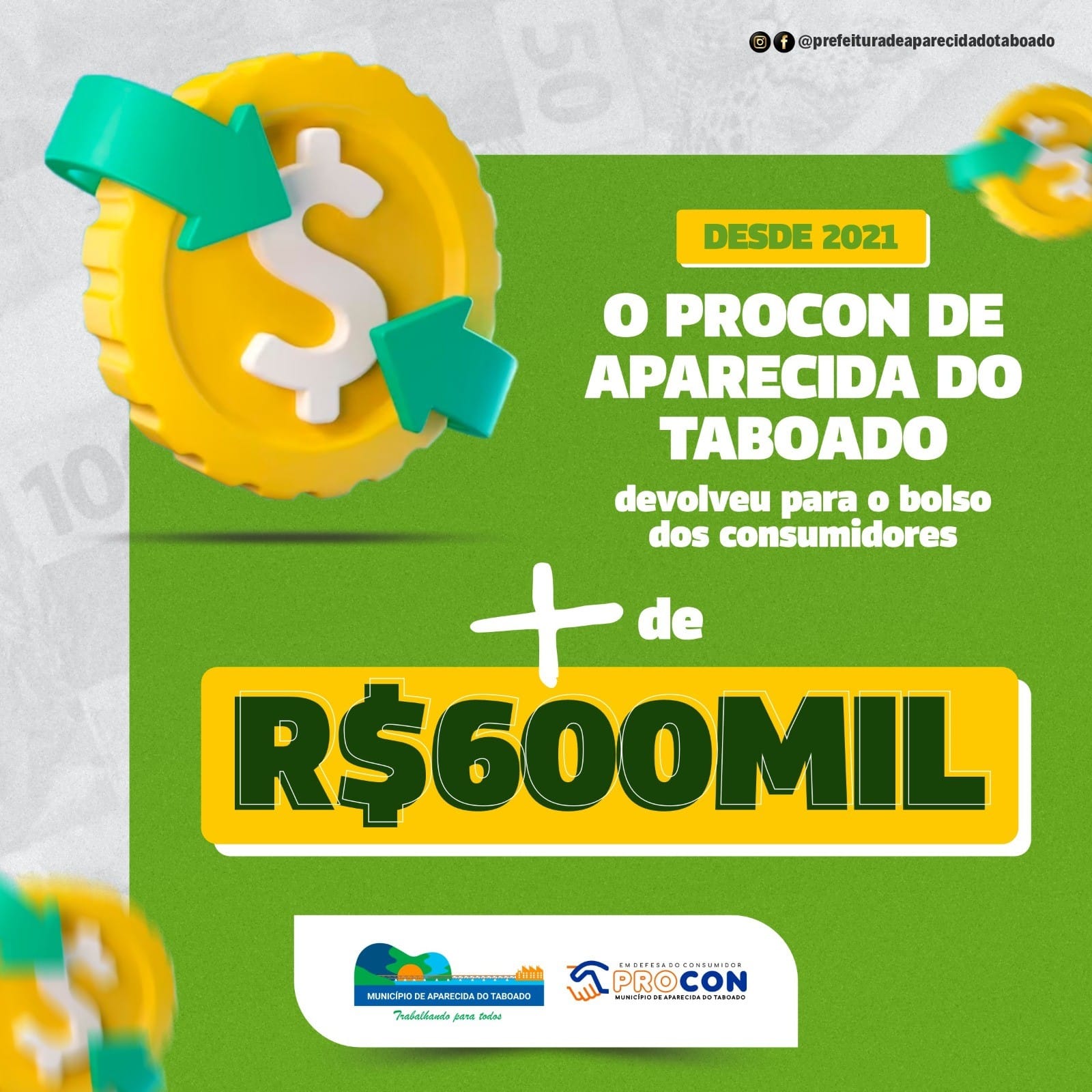 Falando a respeito do trabalho realizado pelo Procon, o prefeito declarou que a excelente equipe composta pela coordenadora Carla, Rita de Cássia e Madalena, “vem prestando um ótimo serviço por Aparecida do Taboado, ressarcindo ao bolso do consumidor mais de 600 mil reais desde o início da administração, sempre conciliando empresas e consumidores”.