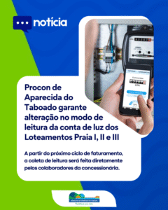 O Procon “Vereador Ivair Garrido Aydar”, de Aparecida do Taboado, informa que foi atendido pela concessionária ENERGISA Mato Grosso do Sul quanto à solicitação de alteração no modo de leitura das contas de energia elétrica nos Loteamentos Praia I, II e III.