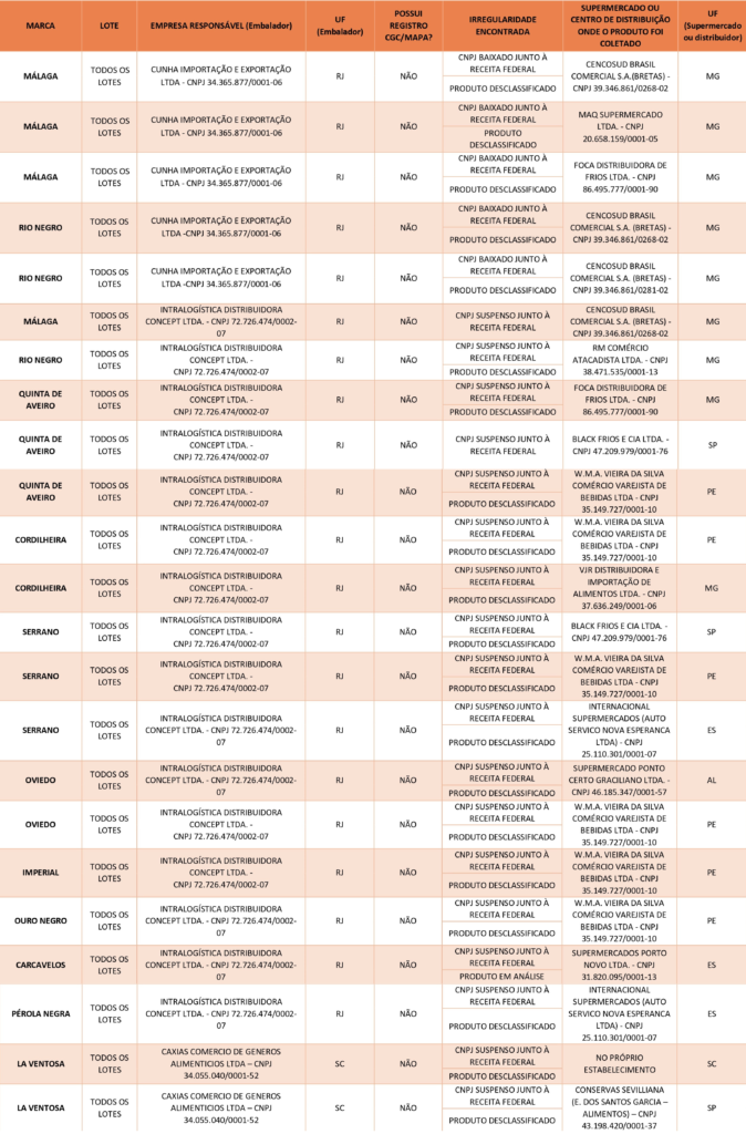 Conforme nota do ministério, as empresas responsáveis pelos produtos apresentam CNPJ baixado junto à Receita Federal, reforçando a ocorrência de fraude. Todos os lotes, nesse caso, são considerados impróprios para consumo.