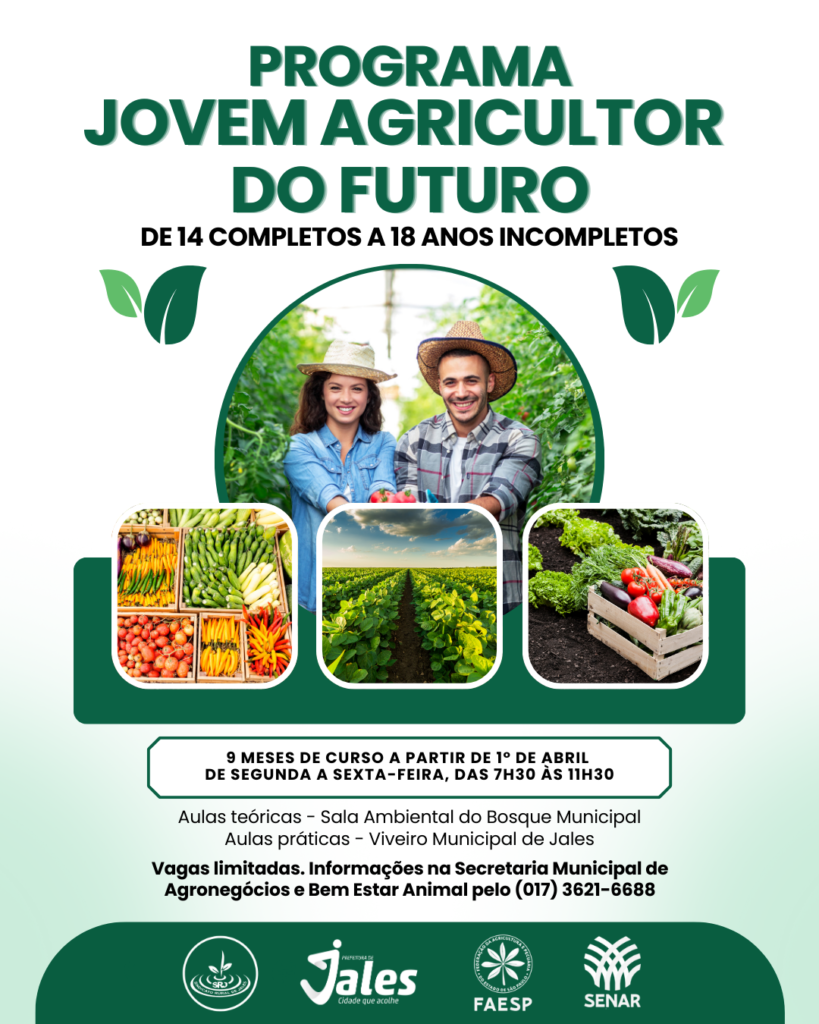 O Programa Jovem Agricultor do Futuro está com inscrições abertas para jovens de 14 a 18 anos incompletos que desejam aprender sobre o setor agrícola e desenvolver habilidades práticas no campo. A iniciativa, que terá duração de nove meses, começa no dia 1º de abril de 2025, com aulas de segunda a sexta-feira, das 7h30 às 11h30.