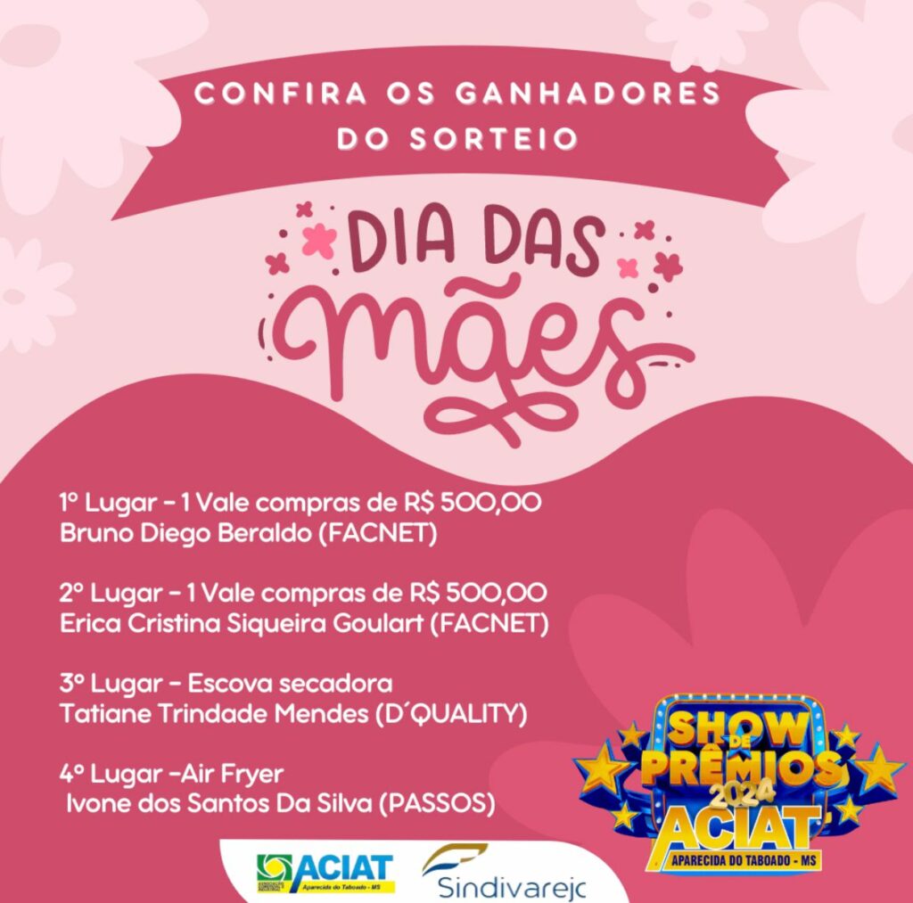 Aparecida do Taboado (MS) -Aconteceu na última sexta-feira (10) o sorteio do Dia das Mães, que faz parte da promoção 4 Amores, na Feira do Produtor. Foram sorteados 1 air fryer, 1 escova secadora e 2 vales-compra no valor de R$500,00 cada. Confira a transmissão ao vivo do sorteio.