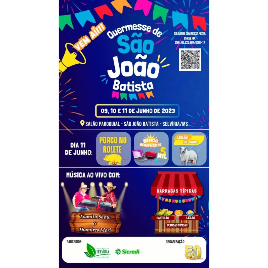 Nos dias 9, 10 e 11 de junho, a paróquia São João Batista irá promover uma grande quermesse, para celebrar o padroeiro de Selvíria, São João Batista.