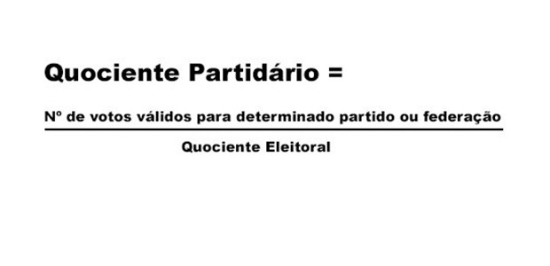 Quociente partidário: é o resultado do número de votos válidos obtidos pelo partido dividido pelo quociente eleitoral (desprezada a fração). O total corresponderá ao número de cadeiras a serem ocupadas pela legenda.