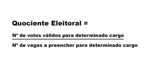 - Quociente eleitoral: é obtido pela soma do número de votos válidos dividida pelo número de cadeiras em disputa. Para o cálculo, despreza-se a fração, se igual ou inferior a 0,5 (meio), ou arredonda-se para 1, se superior.