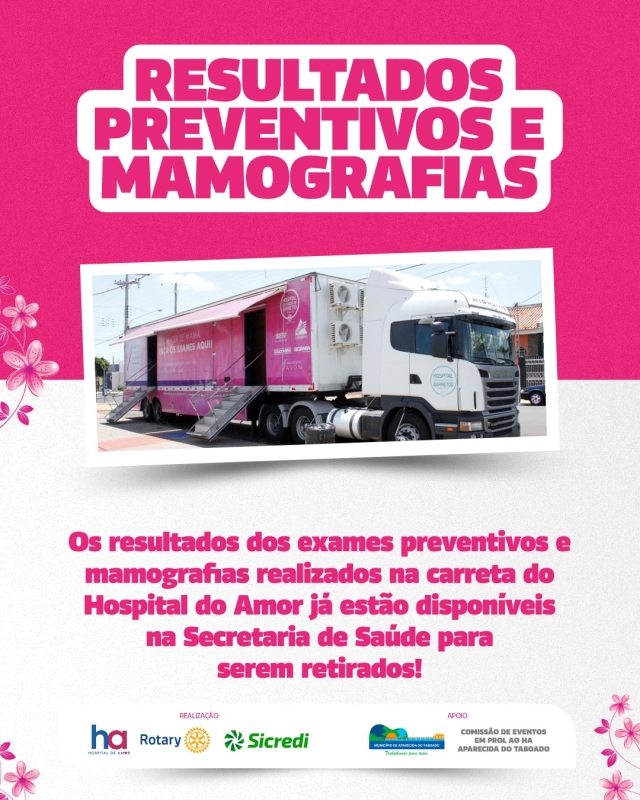 A Secretaria Municipal de Saúde de Aparecida do Taboado informa a todas as mulheres que realizaram exames preventivos e mamografias na Carreta do Hospital do Amor que os resultados já estão disponíveis na sede da secretaria.