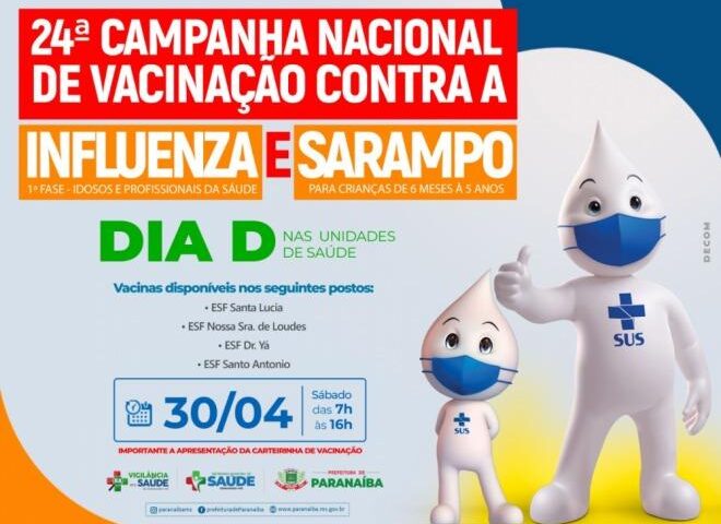 MaisA Prefeitura de Paranaíba, através da Secretaria de Saúde, por meio da Vigilância em Saúde, comunica que o Dia D da 24ª Campanha Nacional de Vacinação contra Influenza (1ª fase para idosos