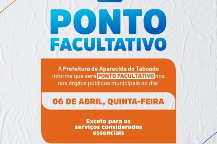 MaisO Governo Municipal de Aparecida do Taboado decretou ponto facultativo nas repartições públicas municipais o expediente do dia 6 de abril, quinta-feira, que antecede ao feriado de 7 de abril, Sexta-Feira da