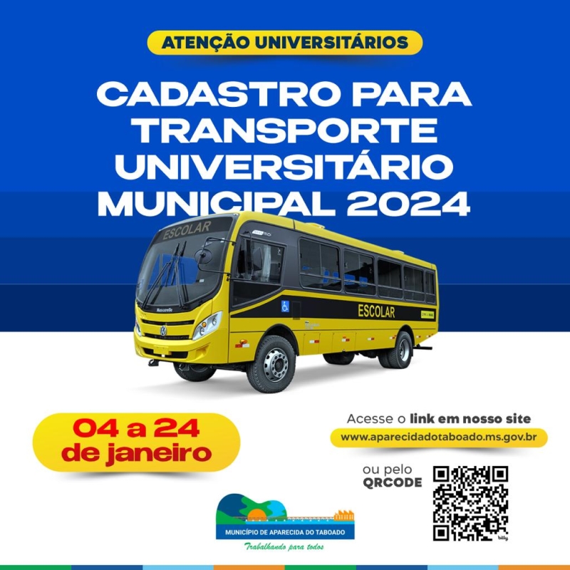 O estudante deve acessar o portal oficial do município: www.aparecidadotaboado.ms.gov.br/, buscar na página principal o campo escrito “acesso rápido” e clicar no ícone “transporte universitário” (que tem como imagem um ônibus). Automaticamente, o universitário será redirecionado para um formulário de cadastro, onde deverá preencher com suas informações corretamente.