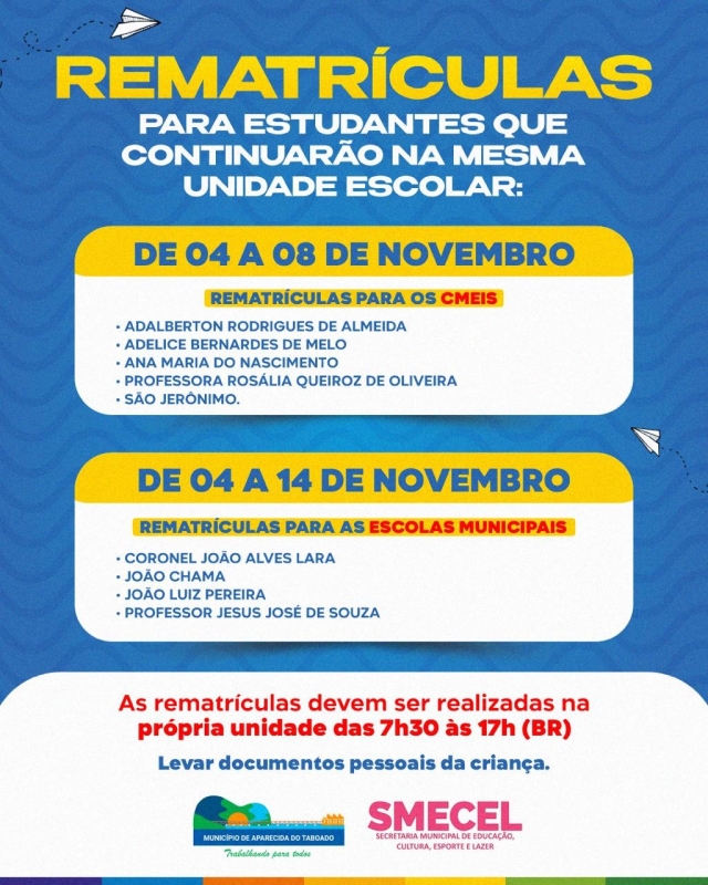A Secretaria Municipal de Educação inicia nesta segunda-feira, dia 4 de novembro, o período de rematrículas para os estudantes dos Centros de Educação Infantil e também do Ensino Fundamental da Rede Municipal de Ensino.